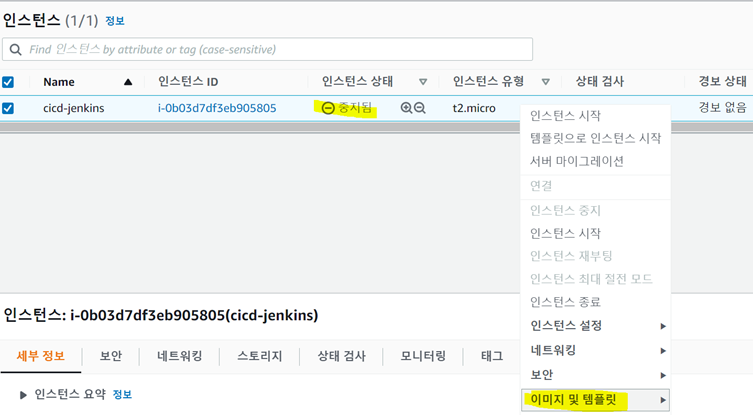 인스턴스가 중지되었으면 우클릭 후 이미지 및 템플릿에 있는 이미지 생성 버튼을 클릭해주세요.