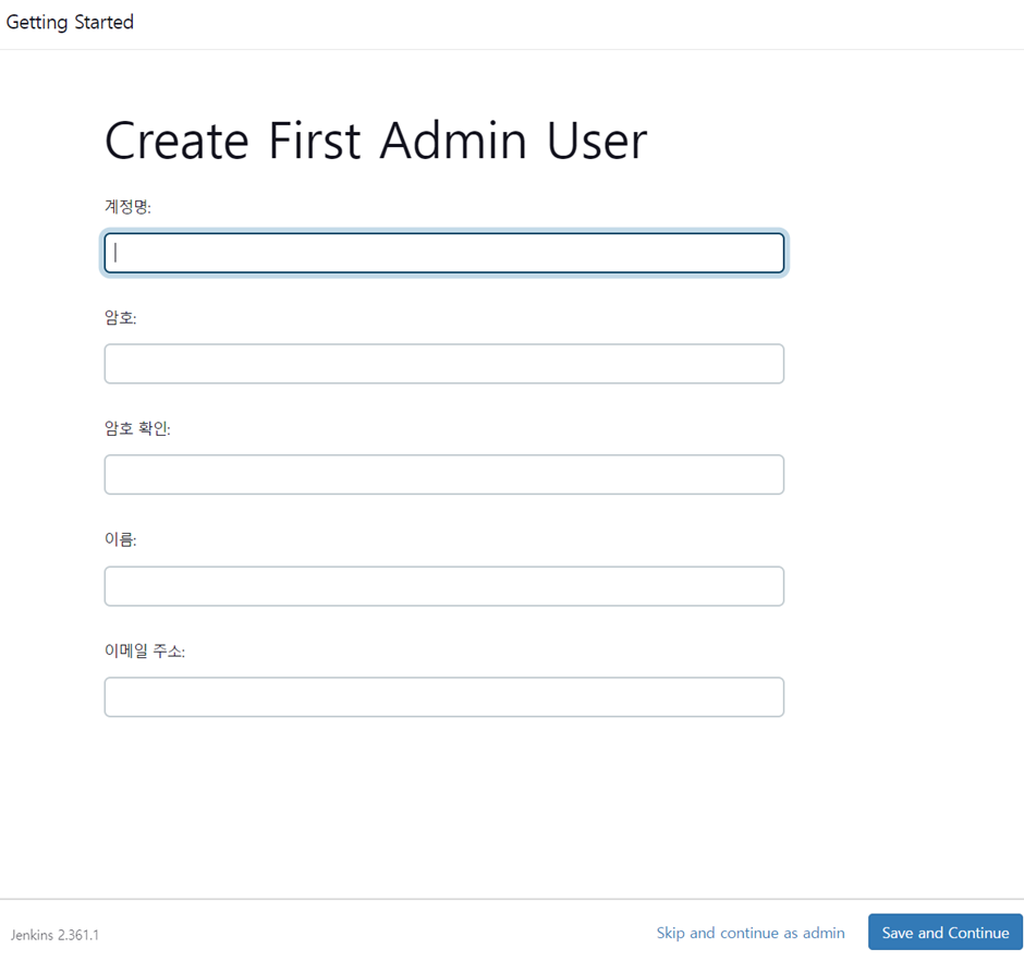 설치가 끝나면 다음과 같은 창이 뜨고 여기에 브라우저를 통해 Jenkins 접속시 사용할 아이디 비밀번호 이메일 등을 입력해 줍니다. 꼭 잊어버리지 않게 어딘가에 메모를 해두세요!