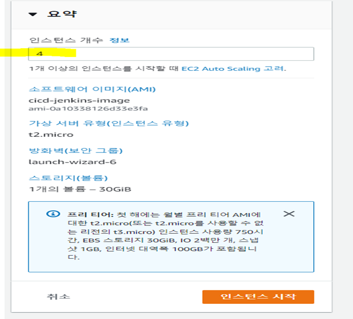 우측 고정 배너에 있는 요약에 인스턴스 개수를 4개로 설정하고 인스턴스 시작버튼을 클릭해줍시다.