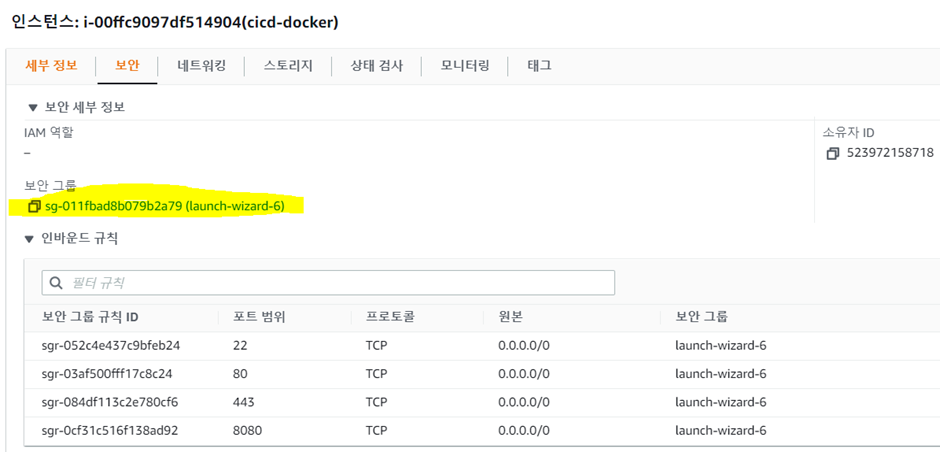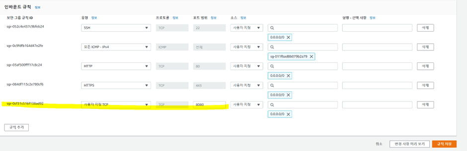 필자의 경우 기존에 사용하던 인스턴스를 재사용하는 것이라 다른 포트도 열려있지만 우선은 8080포트가 열려있지 않다면 열러주세요.