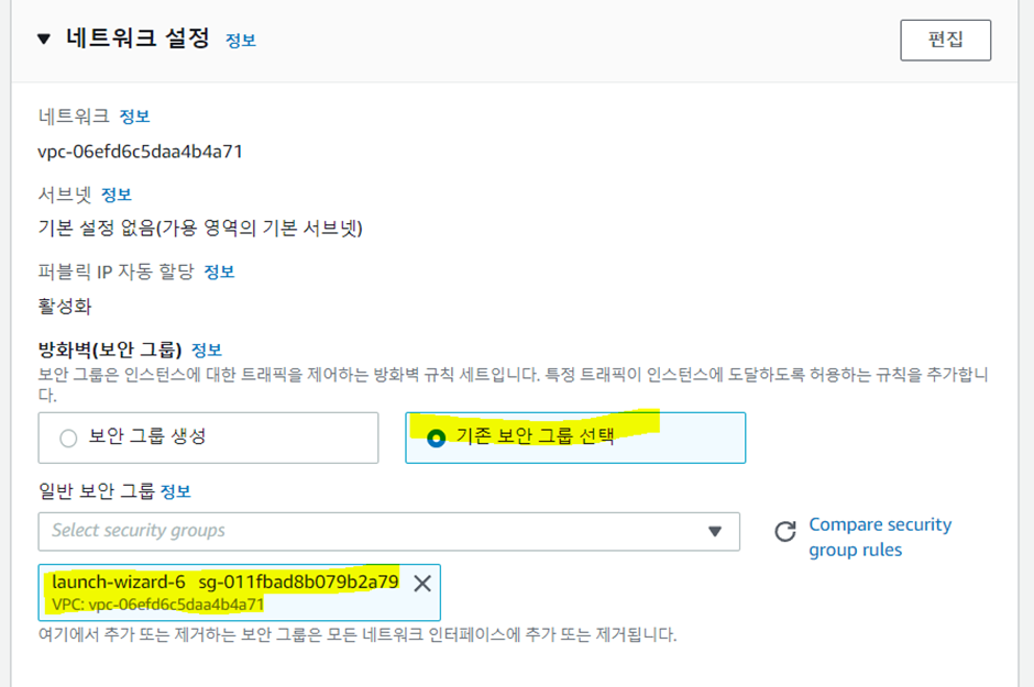 네트워크 설정의 경우 기존 보안그룹 선택을 해주고 위와 동일하게 생성하였던 인스턴스와 동일한 보안그룹을 선택해줍니다.
