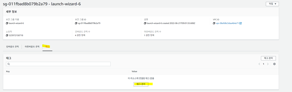 인스턴스가 시작되는 동안 다른 인스턴스에서 편리한 상호 접속을 위하여 보안그룹에서 Tag를 만들어줄 겁니다. 노란색 부분을 클릭해주세요.