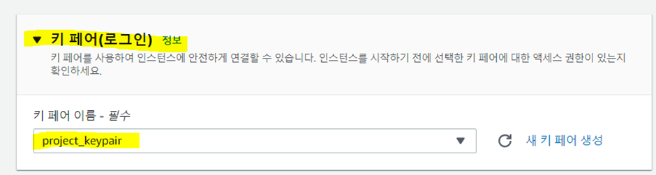 다음으로 넘어와 키 페어(Key-pair)부분은 맨 처음 인스턴스를 만들면서 생성한 키페어를 선택해줄겁니다.