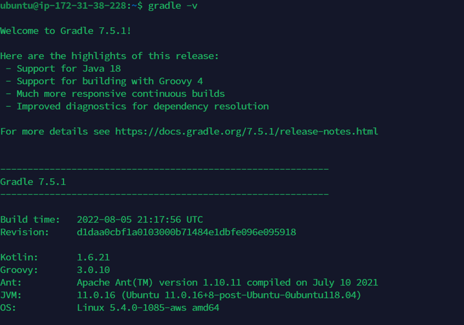 apt-get install gradle을 이용하여도 무방하지만 원하는 버전 또는 최신버전을 사용해보기 위해 직접 설치를 해보도록 하겠습니다. 위의 명령어를 차례대로 입력해주고 gradle 최신 버전을 받아보도록 하겠습니다. 필자는 7.5.1 버전이 최신이기에 이를 다운받아보겠습니다.