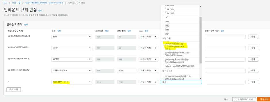 모든 ICPM-IPv4를 선택해주고 보안그룹은 우리가 만들어둔 인스턴스들이 모두 사용하고 있는 보안 그룹을 선택해 줄겁니다. 그리고 규칙 저장을 눌러줍니다.