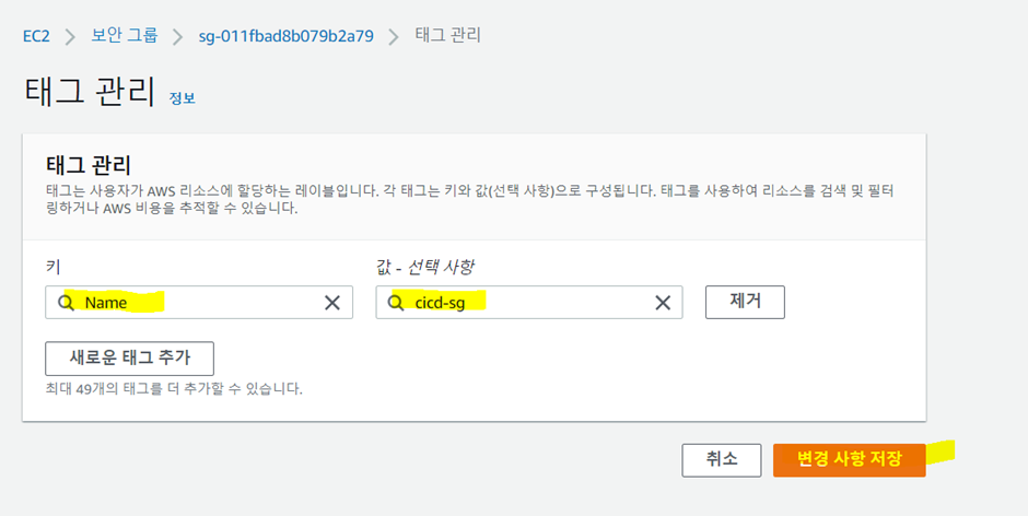 태그가 생성된 것을 확인할 수 있고 이 Tag를 활용하여 보안 그룹을 선택할 수 있습니다.