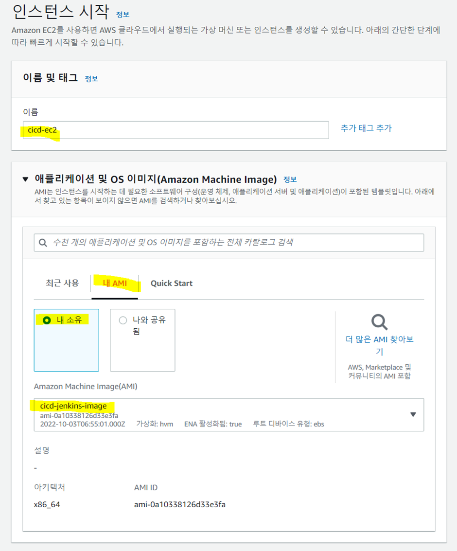 다시 인스턴스로 들어와 새로운 인스턴스를 4개 추가해줄 겁니다. 인스턴스 시작 버튼을 눌러주고 이름을 지정해줍니다. 그 후 내 AMI를 클릭해주고 좀 전에 만들어 두었던 이미지를 선택해줄 겁니다.