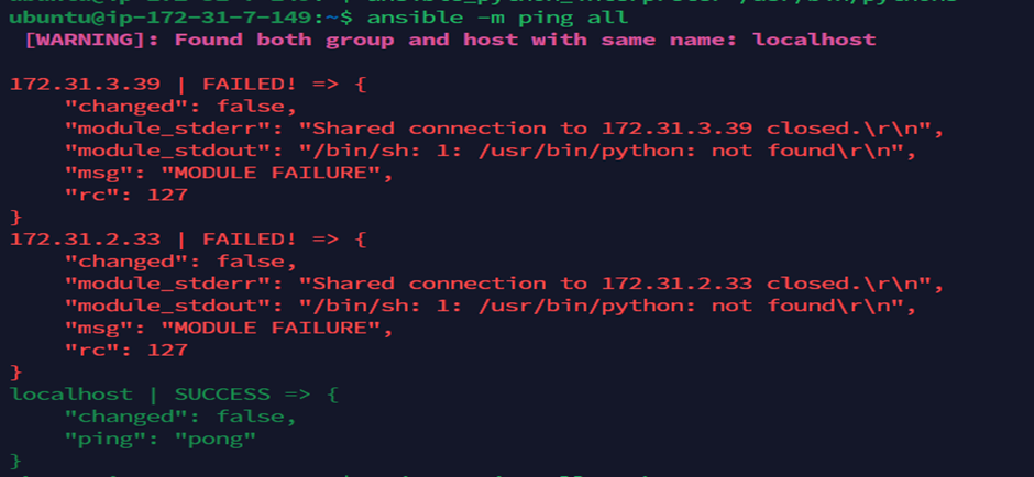 getting below error while executing 'ansible all -m ping' user@user-VirtualBox:/etc/ansible$ ansible all -m ping ip-address | FAILED! => { "changed": false, "module_stderr&