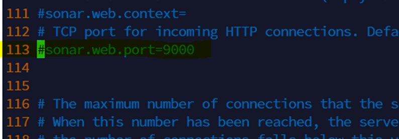 Line number 를 확인하기 위해 :set nu 를 입력해줍니다. 그리고 113번째 줄을 확인해보면 Sonarqube의 웹브라우저 port 번호를 확인할 수 있습니다.