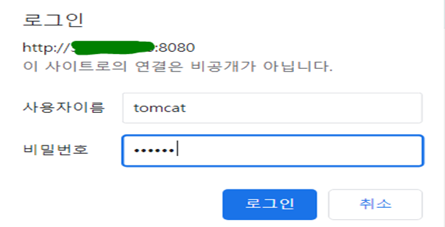 아까 설정을 추가해준 아이디와 tomcat 비밀번호 tomcat으로 로그인을 해줌.