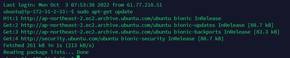 우선 만들어둔 SonarQube 인스턴스의 ssh 접속을 해주고 패키지 업데이트를 해주겠습니다.