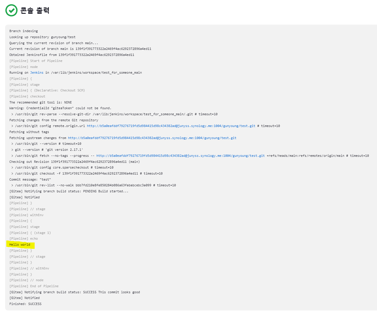 (아래 test 에서 webhook 연결 주소가 http://젠킨스주소/gitea-webhook/post 로 되어 있어서 실패가 되는 것은 아닙니다!)