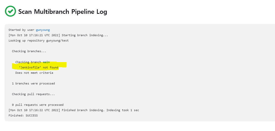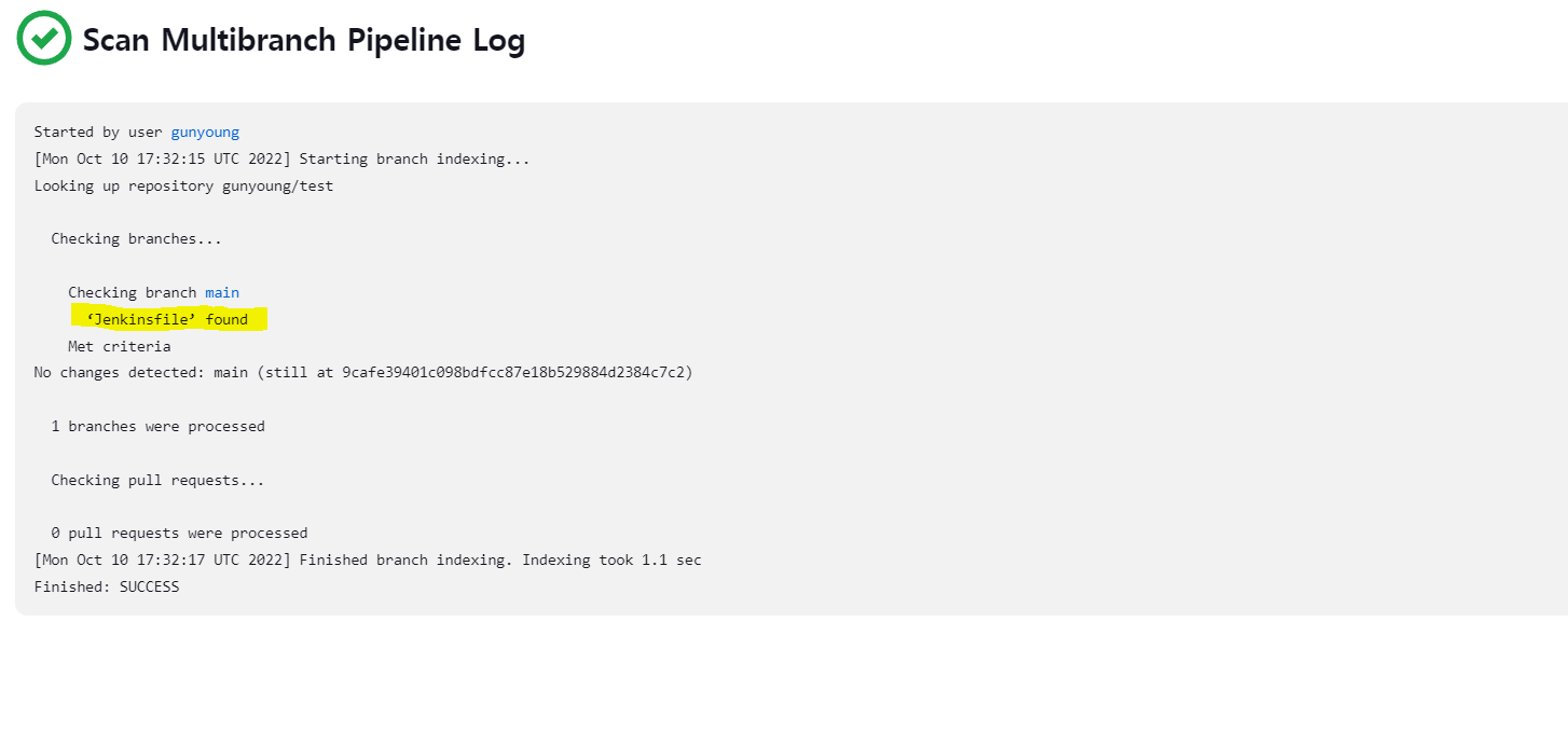 이제 다시 Jenkins Sever로 가서 Scan을 다시 돌려보면 Jenkisfile이 확인이 되었네요!