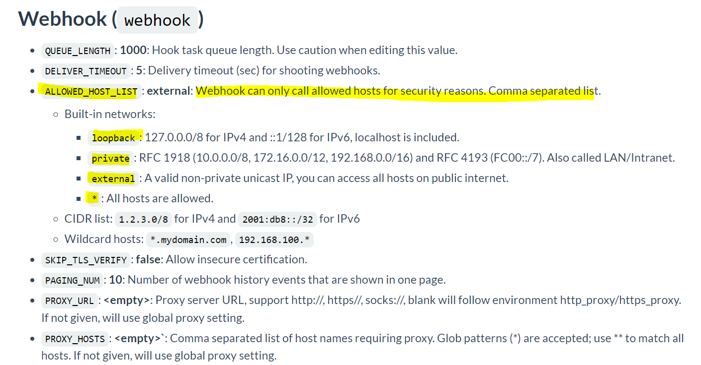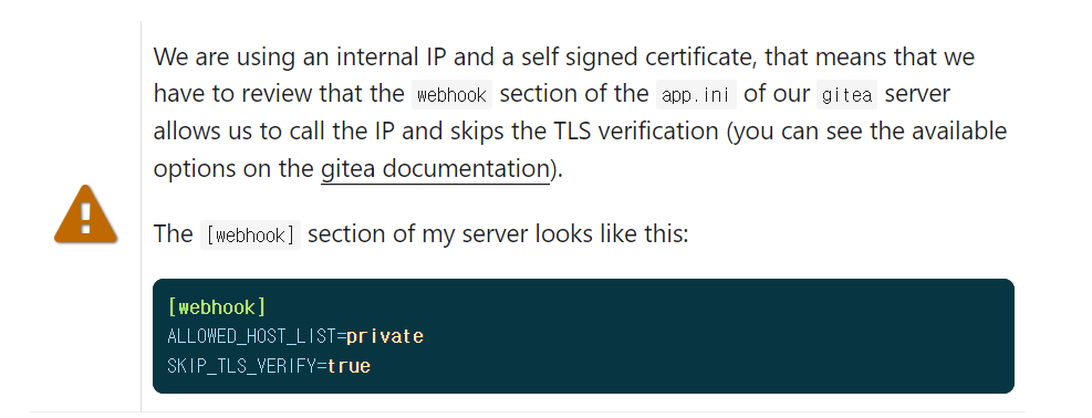 Gitea의 공식문서에 따르면 Webhook 은 허용된 Hosts에서만 가능하다고 나와있습니다.