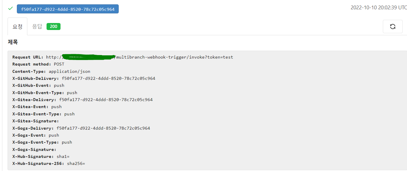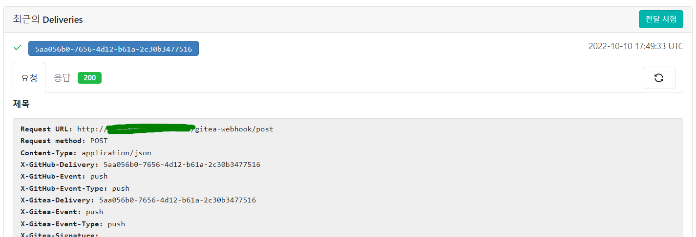 위와 같이 Gitea 서버에 설정을 해주었고 다음과 같이 Webhook이 정상작동하는 것을 확인할 수 있었습니다.