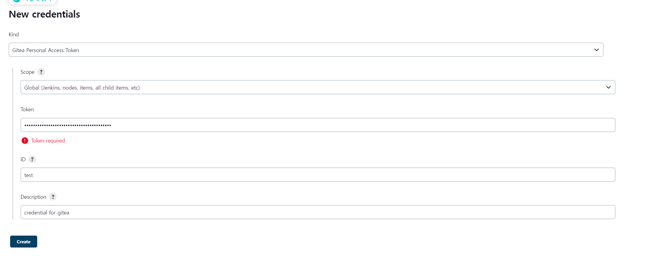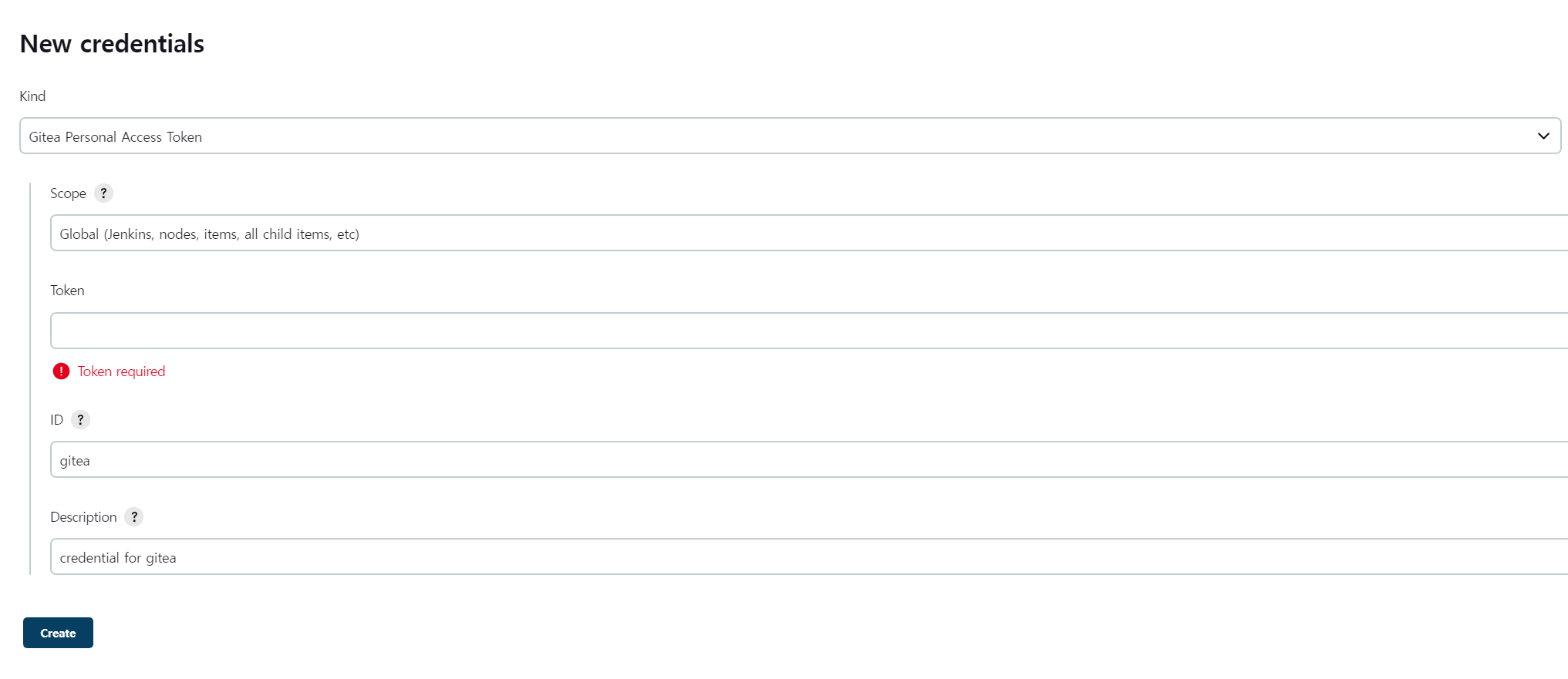 ID = 등록할 이 Credential 를 지칭할 이름 (필자의 경우 이미 Gitea라는 ID로 Credential 을 등록하였기에 이미 사용중인 ID라고 뜬다)