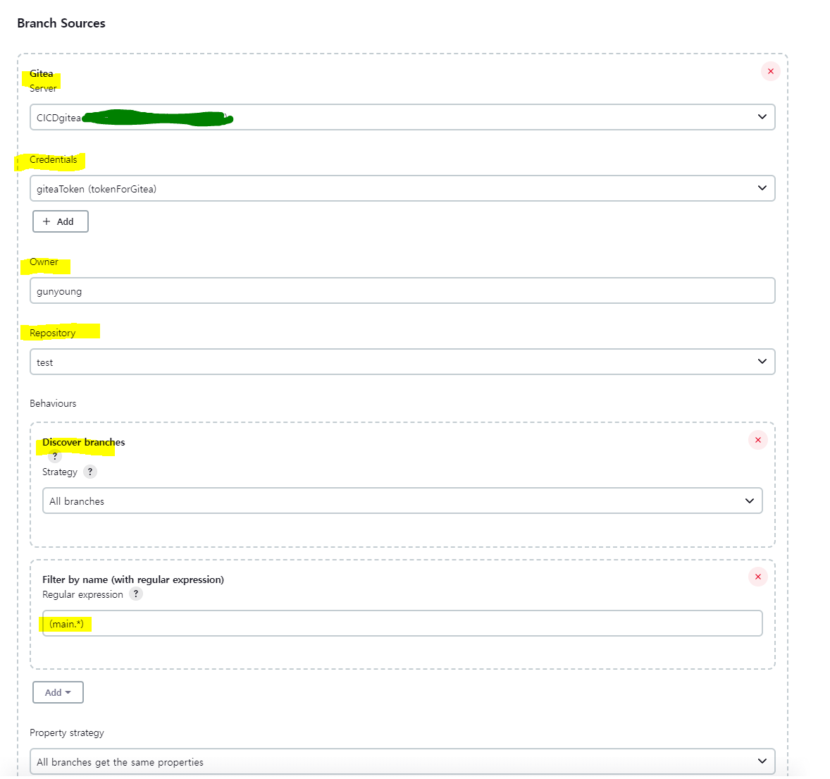 Server = 처음 Gitea plugin을 설치하고 Jenkins 시스템 설정에서 Gitea server를 등록해주었기에 바로 설정이 잡혀 있을 겁니다. 만약 Gitea이외에 Gihub, Gitlab등 Jenkins 시스템 설정에 다른 설정도 등록 되어있다면 처음에 등록해준 Gitea를 선택해주세요.