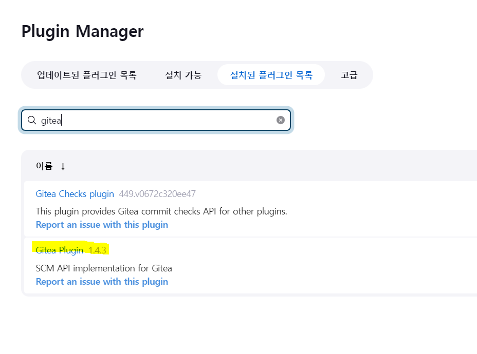 필자의 경우 이미 plugin을 설치하였기 때문에 설치가 되어 있지 않다면 설치 가능에 들어가 Gitea Plugin을 설치해주도록 합니다.