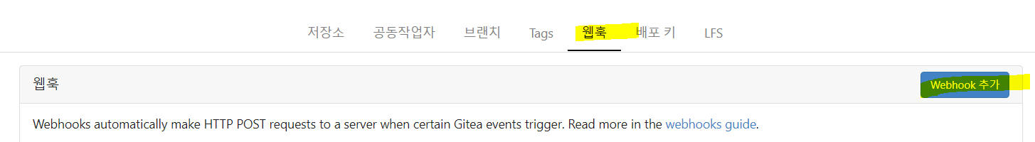 이제 Gitea로 가서 Webhook 설정을 해보도록 하겠습니다.