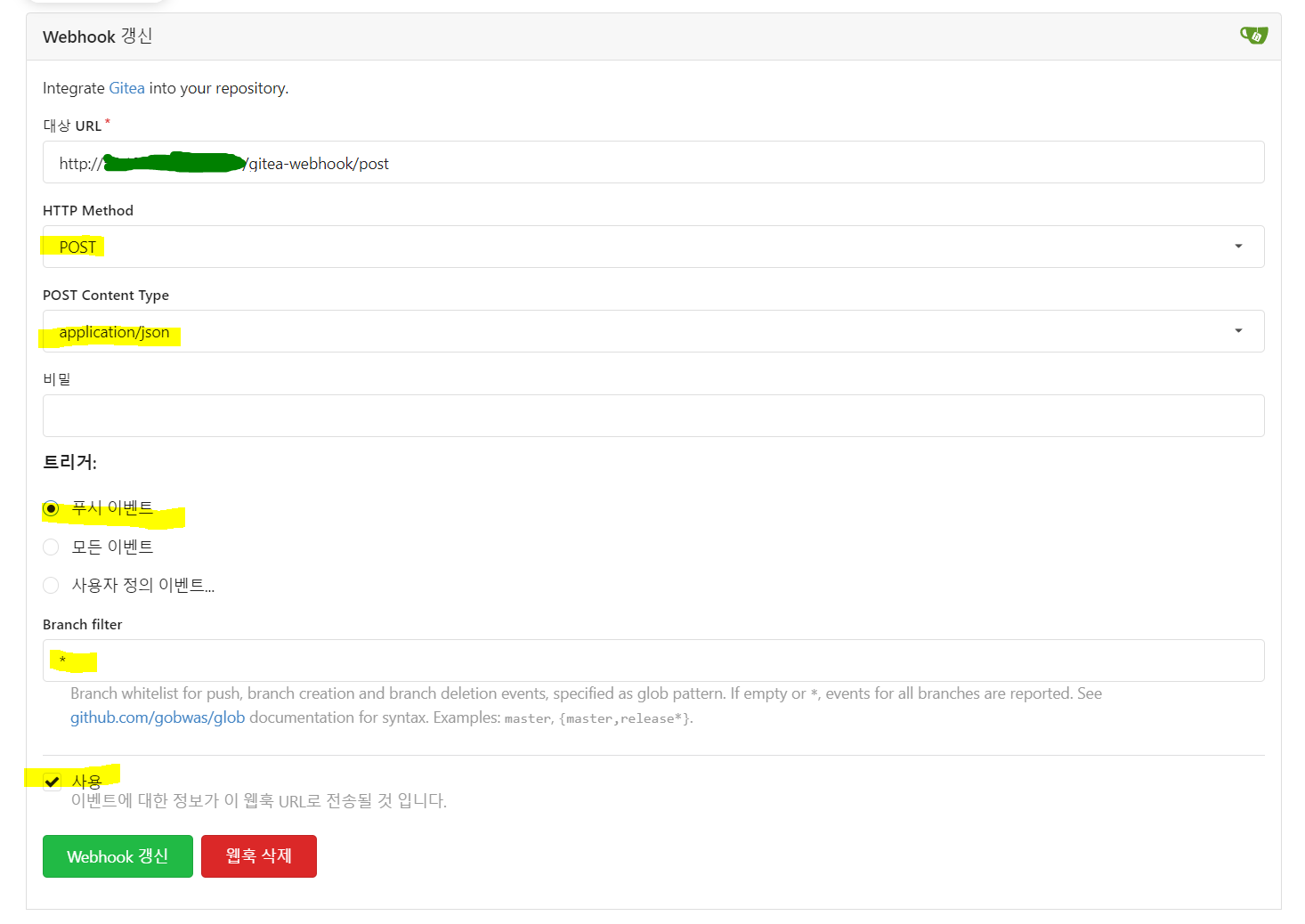 다음과 같이 설정을 모두 마친 후 Webhook 갱신 을 눌러주세요.