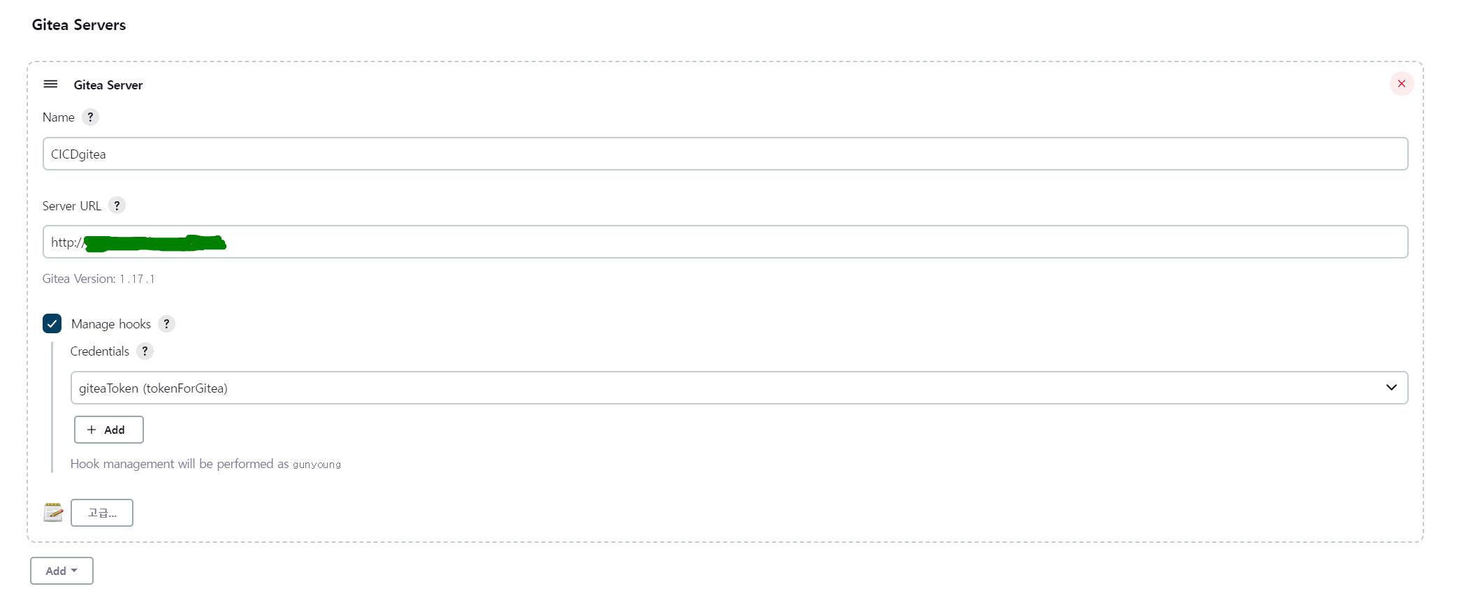 Server URL = (Gitea URL 입력) 입력을 하였을 때 아래와 같이 Gitea version이 떠야 정상적으로 등록이 된 겁니다 =)