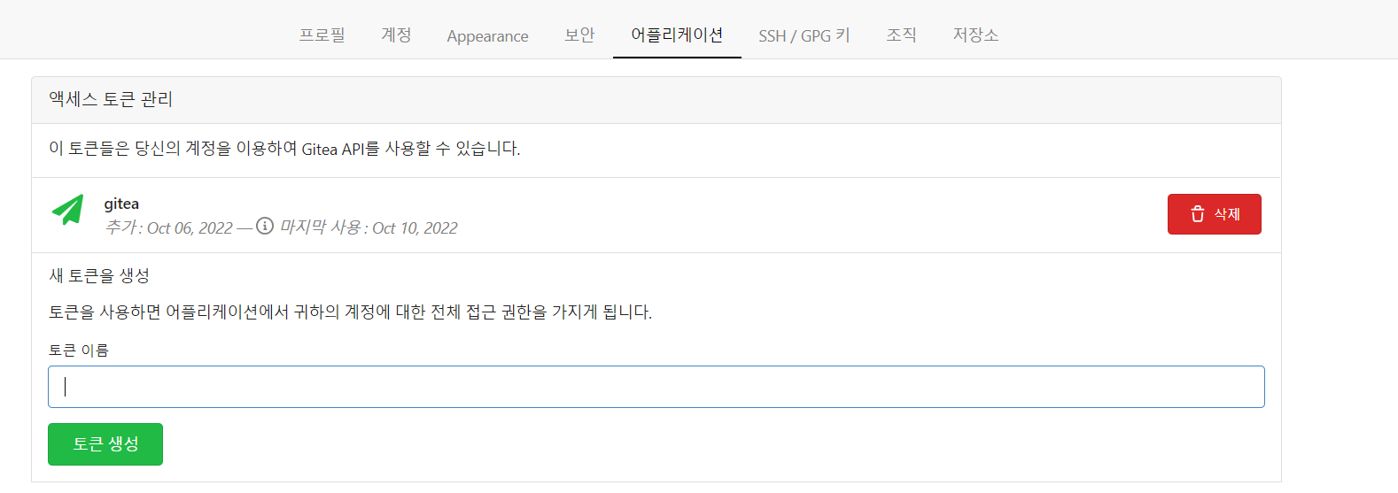Gitea로 넘어와 로그인을 한 후 설정 - 어플리케이션 -엑세스 토큰 관리 에서 사용할 토큰이름을 지정해주고 토큰생성을 눌러주세요. 필자의 경우 이미 gitea라는 이름의 토큰을 생성하여 위와 같이 토큰이 있는 것을 확인할 수 있습니다.