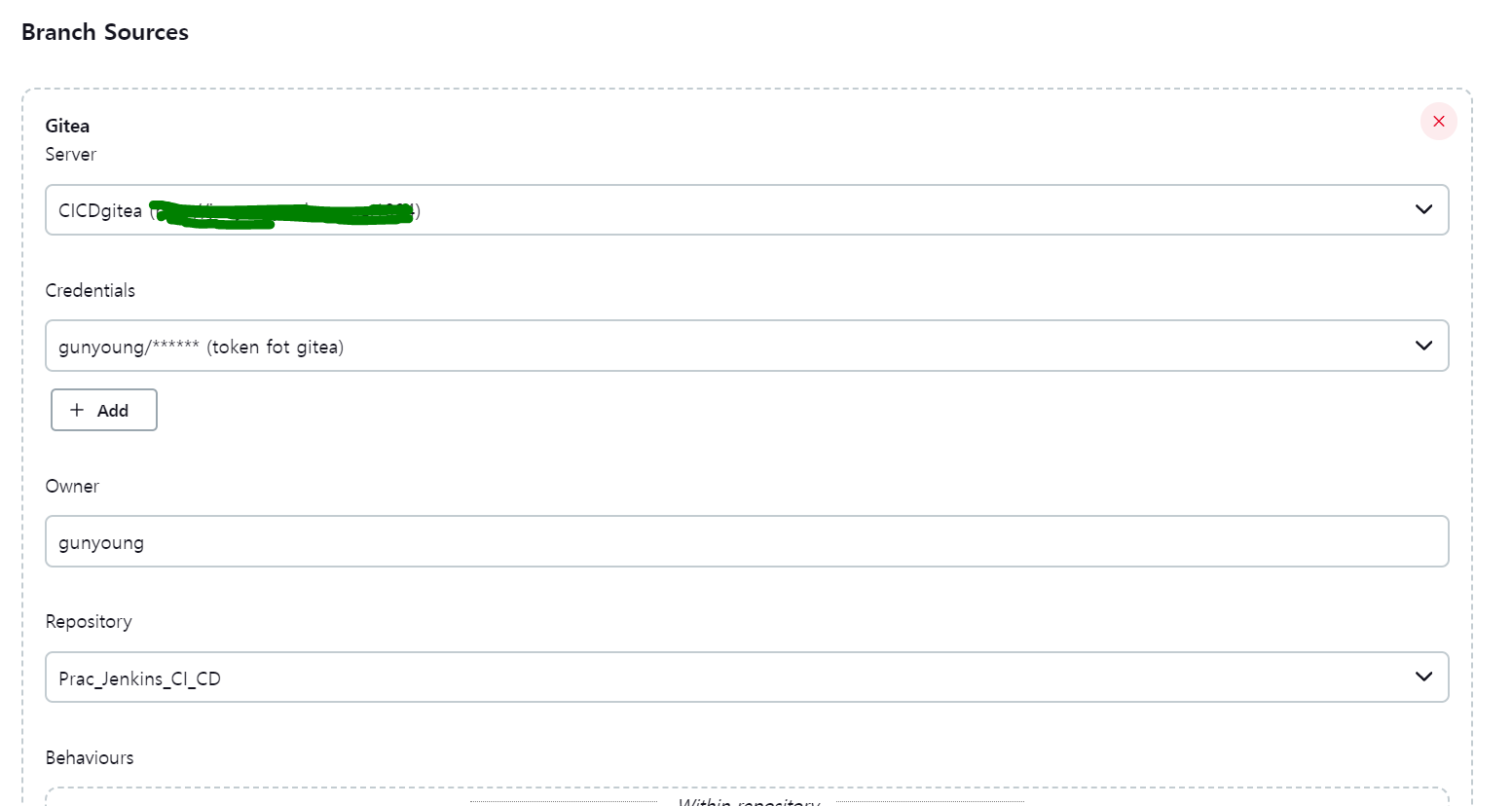 현재 Jenkins Credentials의 kind는 username&password로 잡혀 있고 Prac_Jenkins_CI_CD repo는 private이기 때문에 credentials가 맞을 경우에만 해당 repo를 Branch Source에서 확인할 수 있다. 그럼 Credentials는 올바르게 작동을 하고 있다는 뜻이다.