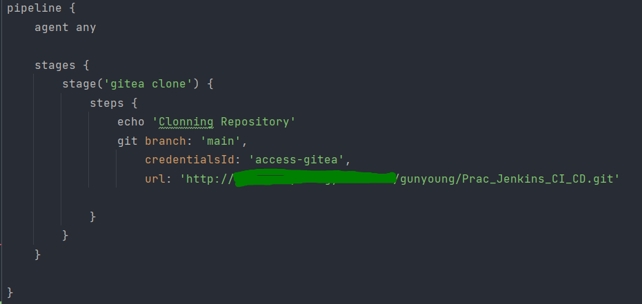 password= personal accessToken (Github또는 Gitea 등 자신이 사용하는 형상관리 tool 에서 access token 발급)
