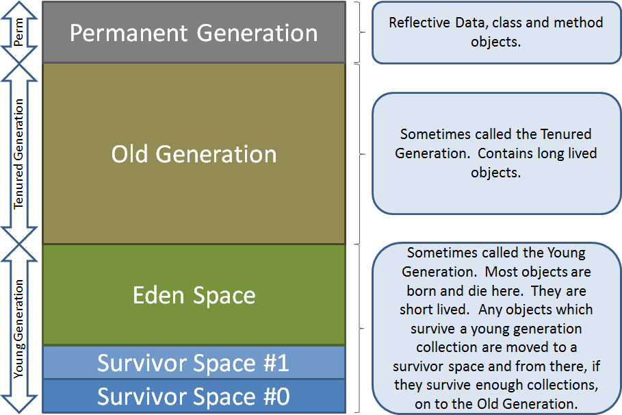 객체가 새로 할당되면 young generation 의 eden 영영에 할당이 이루어지고, eden 영역이 꽉 차게 되면 garbage collecting 을 실시하게 된다. 이때 아직 사용되고 있는 객체들은 survivor 영역으로 이동을 하게 된다. survivor 영역은 2개로 나뉘어져 있고, 이 중 하나는 항상 비어있는 상태로 유지가 된다.
